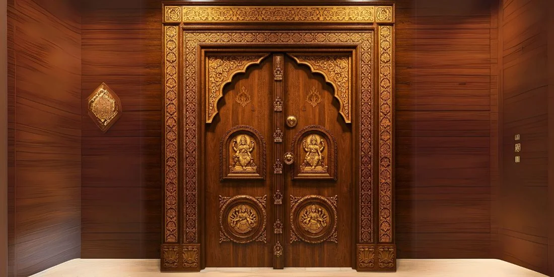 Explore 20+ elegant pooja room door design ideas that elevate your home's spiritual ambiance.